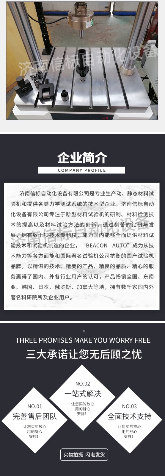 濟南信標自動化設備有限公司主要生產:動靜態萬能疲勞試驗機,接骨板彎曲試驗機,縫合線拉伸疲勞試驗機,髖膝關節磨損試驗機,電子萬能試驗機、液壓萬能試驗機、巖石三軸、四軸,電液拉力試驗機,材料試驗機,高低溫蠕變,高低頻疲勞,拉伸、扭轉、杯突等二十多個系列兩千多個的品種。